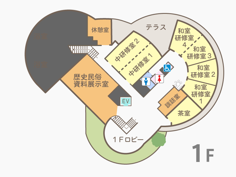 館内には最大200名収容の大研修室をはじめとする和洋研修室を全7室備え、その他にも調理実習室、歴史民俗資料展示室、茶室、大村湾を望む展望浴室など、充実の設備があります。